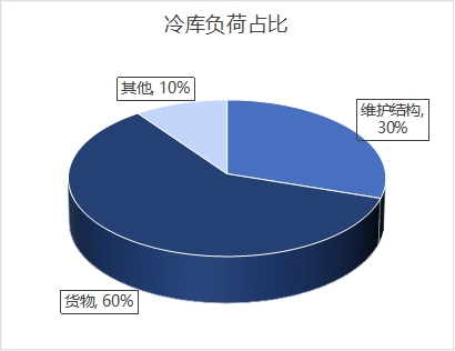 首先我們需要了解冷庫的負(fù)荷組成,冷庫負(fù)荷主要包括圍護(hù)結(jié)構(gòu)負(fù)荷,進(jìn)貨貨物負(fù)荷(不超過庫容量的10%),照明、設(shè)備、人員操作負(fù)荷。其中維護(hù)結(jié)構(gòu)的負(fù)荷占比達(dá)20~30%,貨物負(fù)荷占比60%左右,其他占10%。